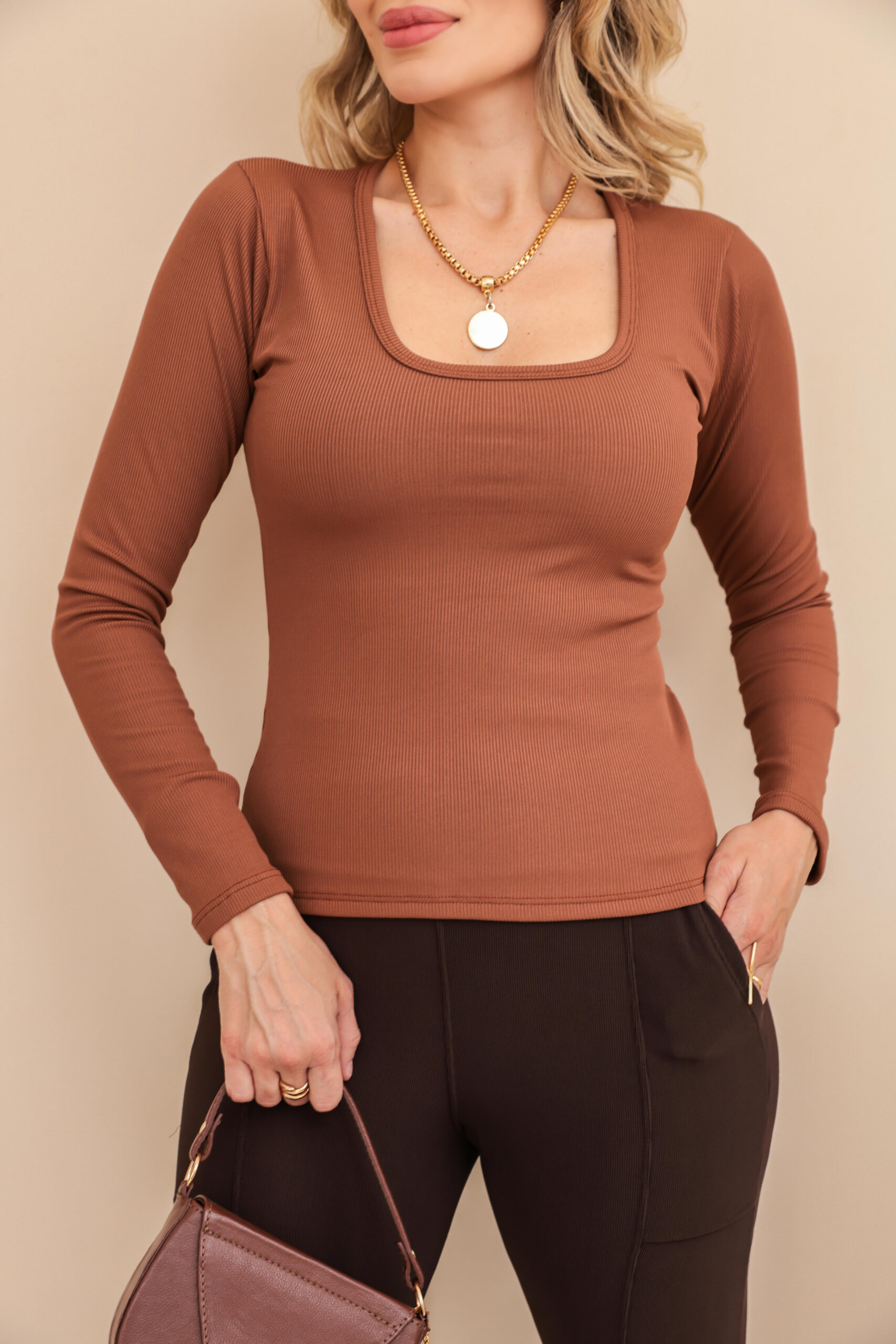 Blusa Manga Longa Gola Quadrada – Sofisticação e Conforto Aconchegante